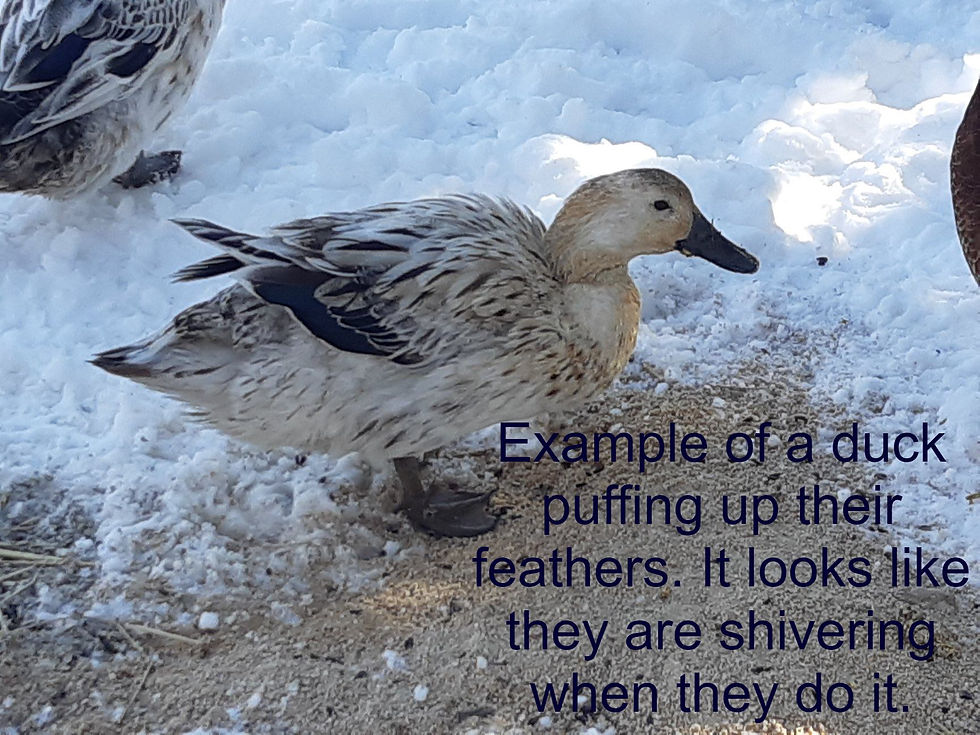 How can we help our birds to loose less heat in the winter months. This is simple we allow them to do what nature intended for them. But we can help by setting us windbreak areas. Wind is the biggest problem as it ruffles your waterfowls feathers and then they lose the warm air they had trapped in the down! We can keep them dry, keep waters outside to help keep their bedding and coop drier. We can give them access to swimming water when it is warm enough, periodically, through the winter to ensure their feathers stay in optimal condition. Without their oil glands and preening which giving them a waterproof/weatherproof layer on their feathers they cannot maintain their heat in the down. Once the down gets wet it cannot trap the air between it any longer, so it's very important to help your waterfowl maintain their feather condition during the winter!