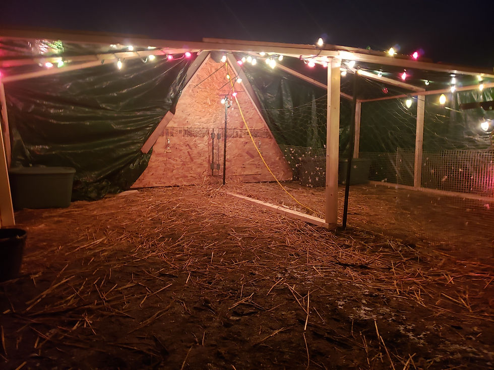Second thing, wind blocks/proper venting. You need to keep those vents high as explained above so there is no wind on the birds and their exposed skin. Proper vents and wind-breaks outside are honestly the biggest things I suggest for people when they ask me about winter care and their waterfowl. That can be as simple as having a spruce tree in their pen that they can get under the low laying branches and out of the wind. It can be having their coop right inside their pen so they can get around the whole coop and use the coop itself as a wind-break. You can set up tarps, poly, or wood along the side of their pen or tarp garages. Or you can build them a covered enclosure that can be wrapped with greenhouse poly, 10mil poly, tarps or wood. The choice is yours but I do suggest they have somewhere outside the coop to be without being in the wind. This isn't just for frostbite reasons, this is also due to the wind ruffling their feathers and then they lose the trapped air in the down layer and that is how they regulate their temperature. I have a blog on this called "Fluffing feathers and shaking, what it really means for your waterfowl." if you would like to read about it.